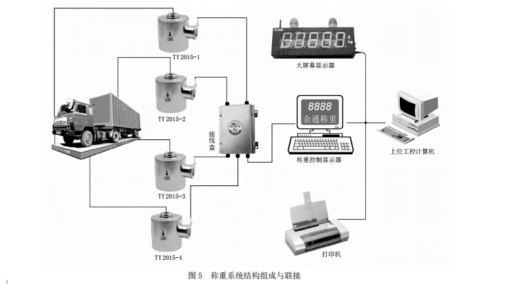 (二) 稱重系統主要功能:汽車衡稱重系統主體結構與聯接如圖 5 所示。由承重秤體、稱重傳感器(4 組)、稱重信號接線盒、稱重顯示控制器、大屏顯示器、打印機等組成,稱重數字信號可上傳到上位工控計算機。